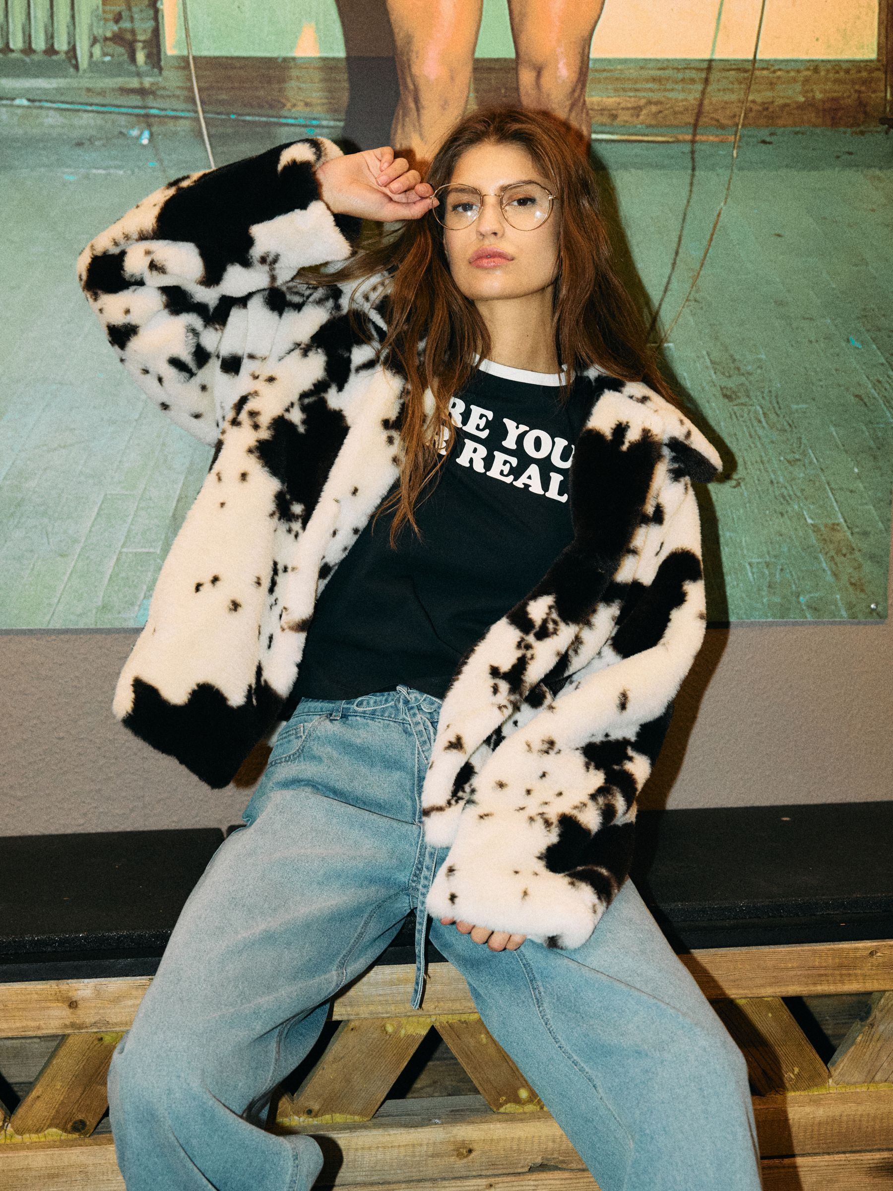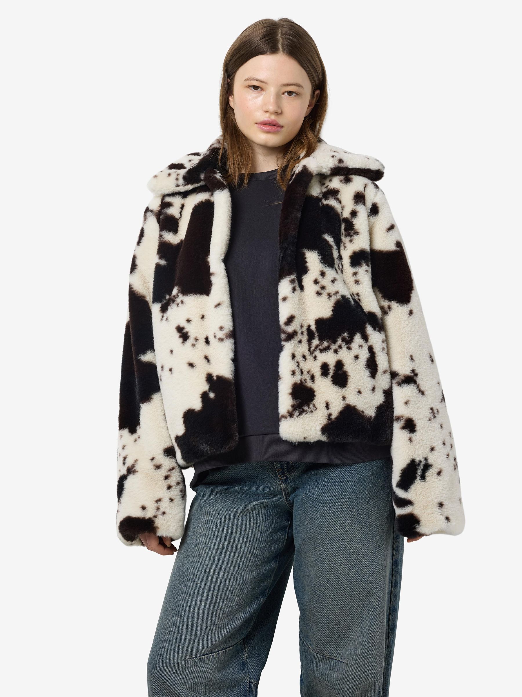 – Faux fur cow print coat- Large spread collar- Long sleeves- Button-up front- Side pockets- Fully lined- Regular fit- Model is 179cm tall and wearing size M