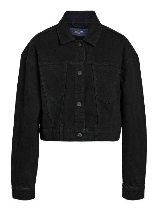 – Cropped denim jacket- Spread collar- Dropped shoulders- Long sleeves- Button-up front- Patch pockets at chest- Regular fit- Model is wearing size M