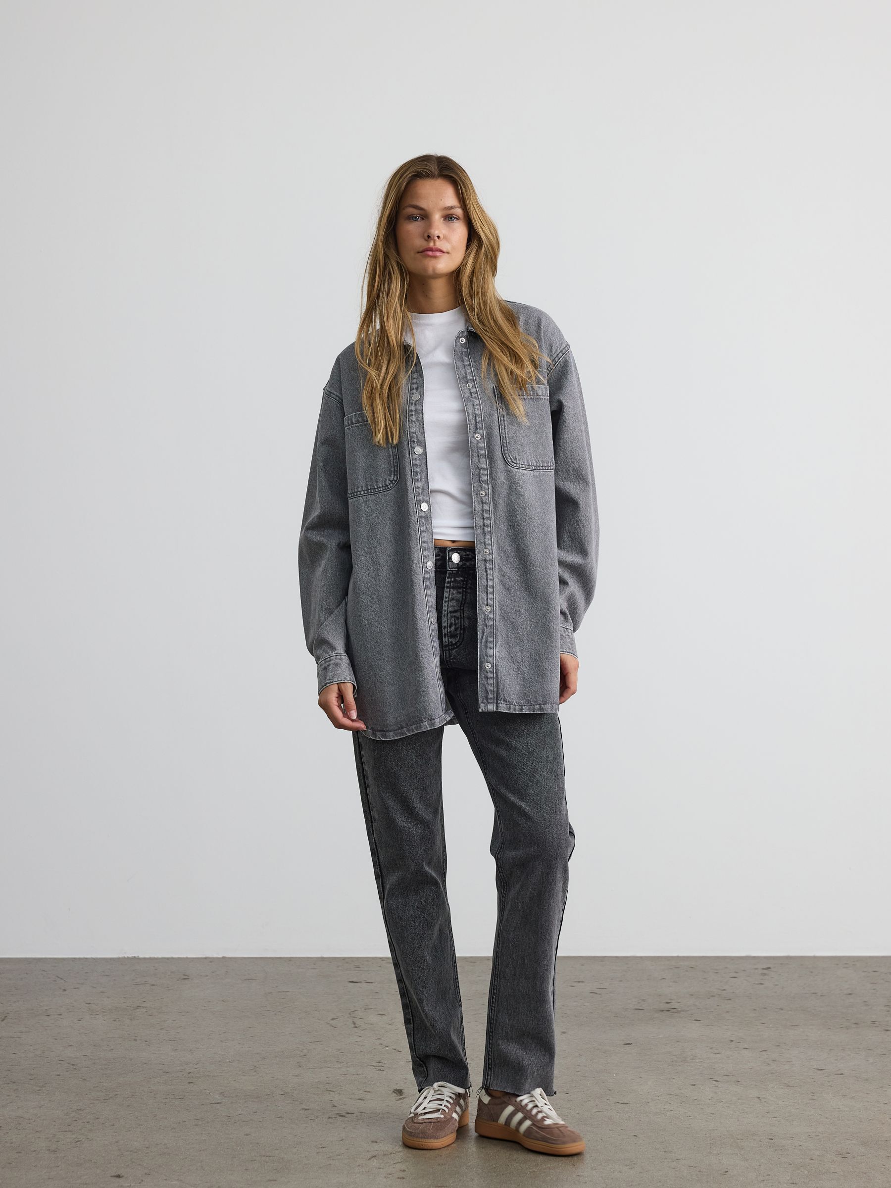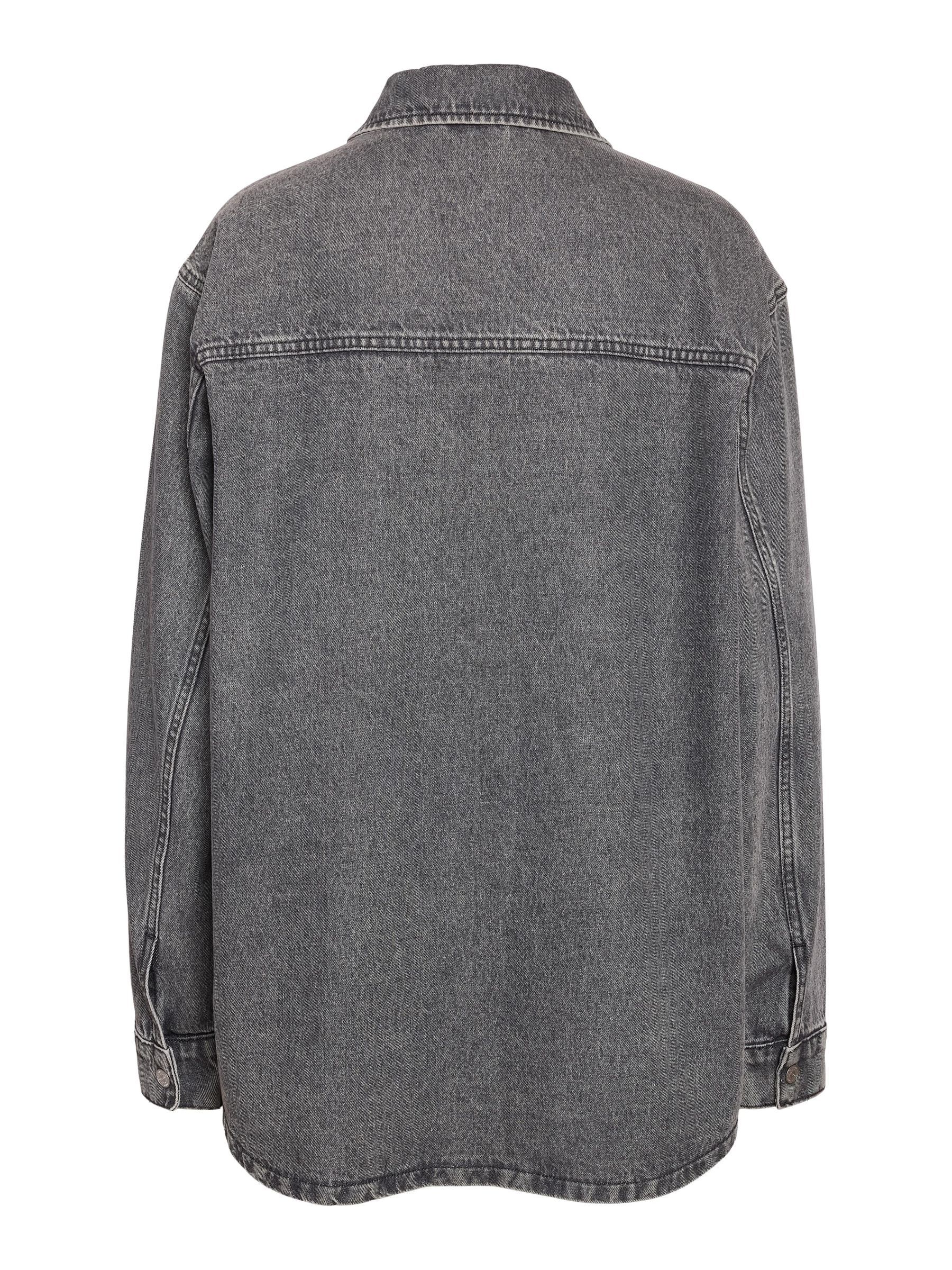 – Longline denim shacket- Regular collar- Dropped shoulders- Long sleeves- Buttoned cuffs- Patch pockets at chest- Button-up front- Relaxed fit- Model is 179cm tall and wearing size M