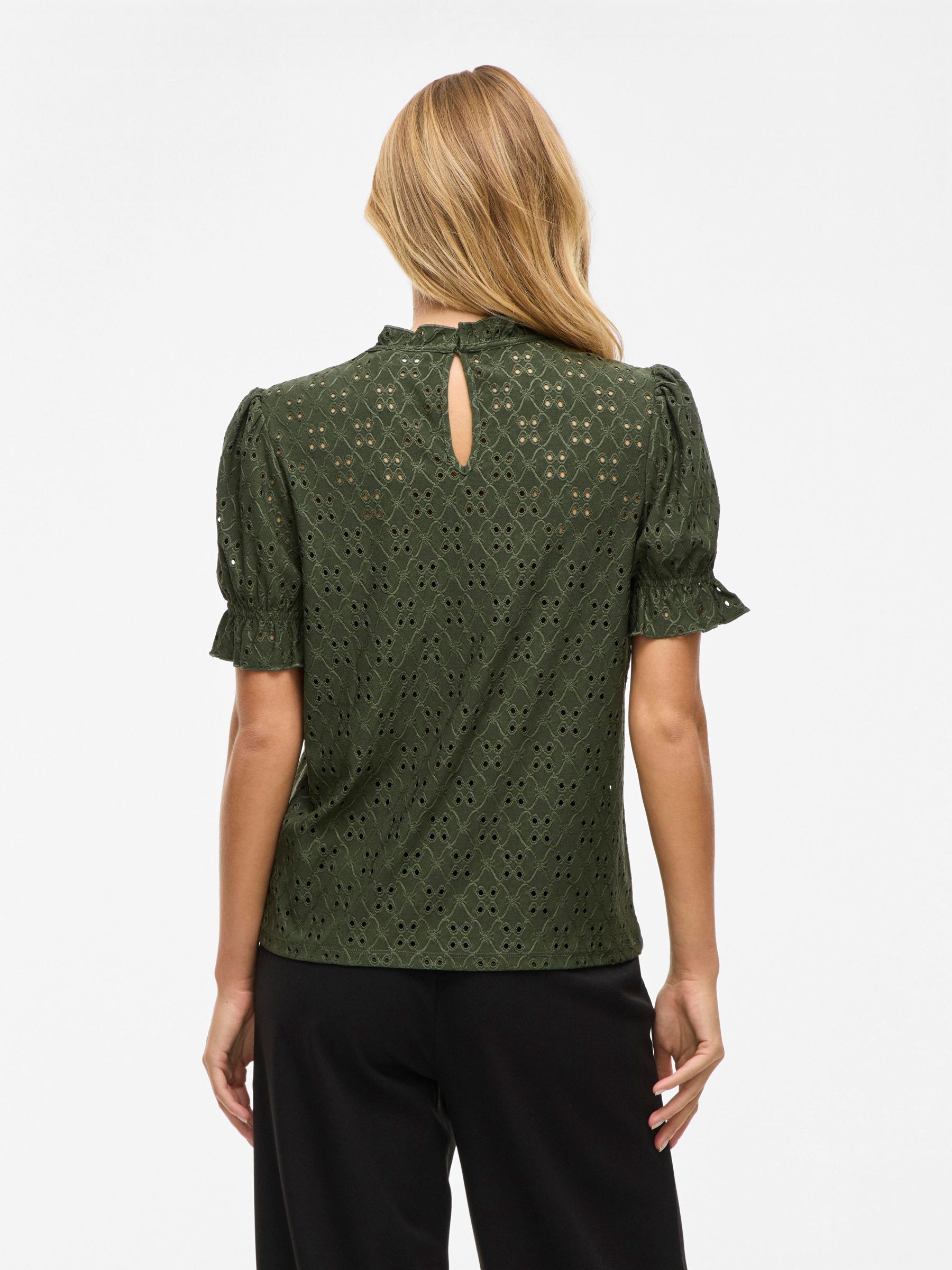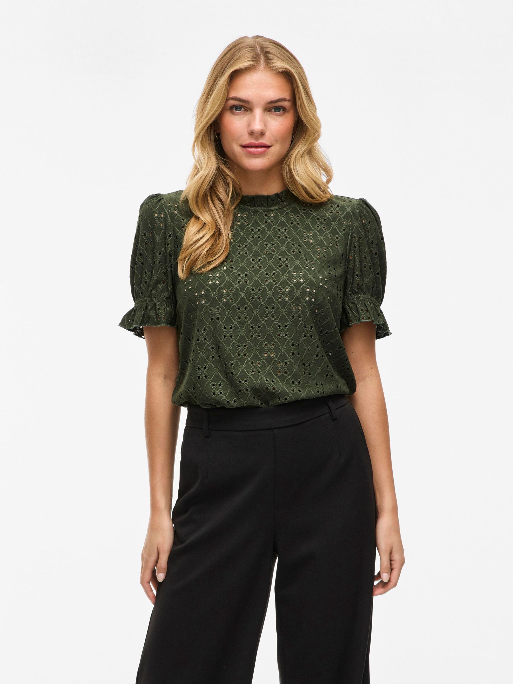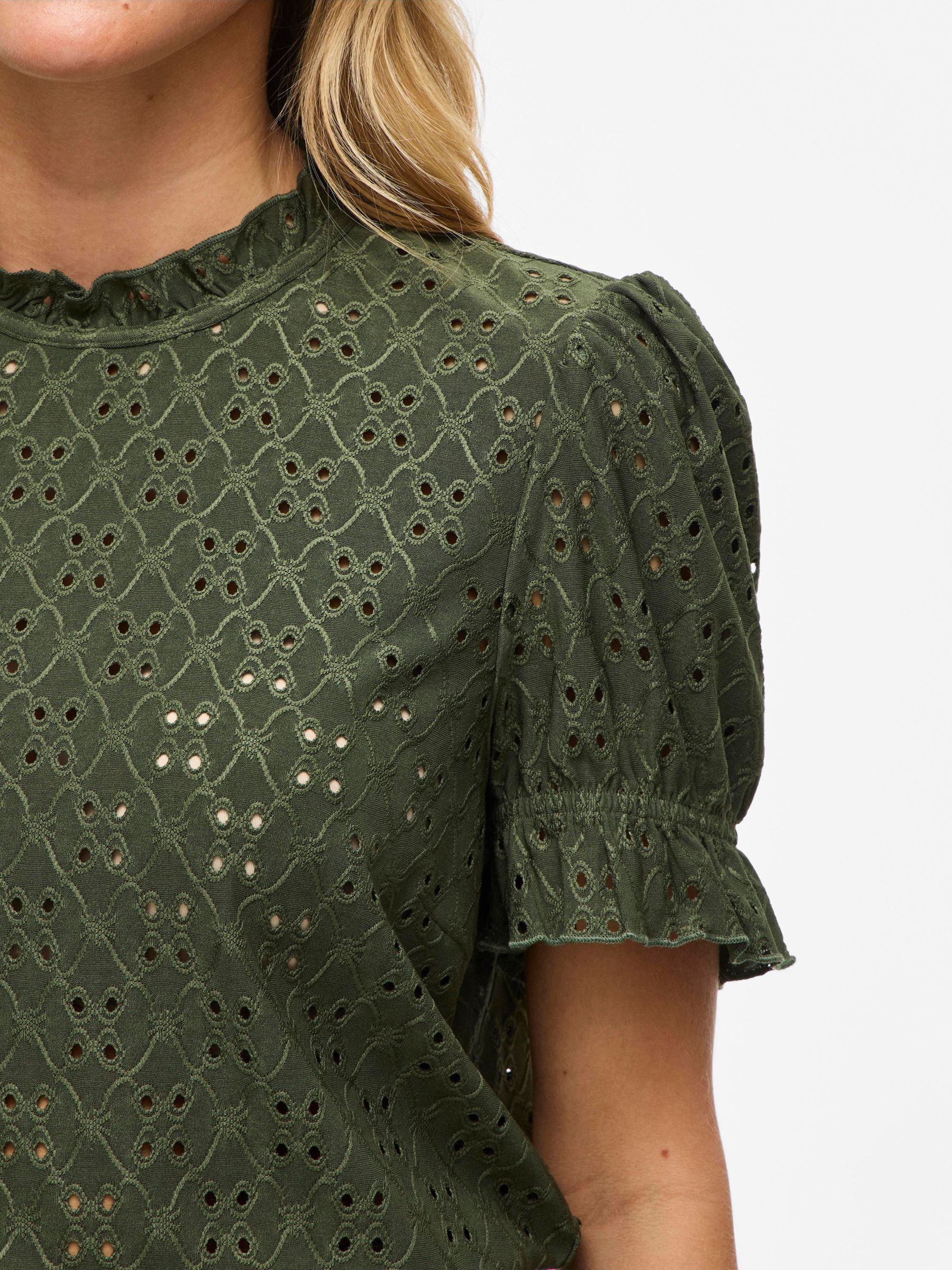 – Short-sleeved, detailed blouse- Ruffle neckline with keyhole closure at back- Embroidered and perforated design- Ruffle details at sleeves- Stretchy fabric- Length: 63 cm in size M- Sleeve length: 24 cm in size M- Our model is 178 cm tall and wears size M