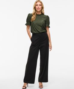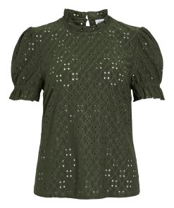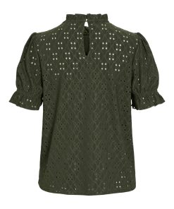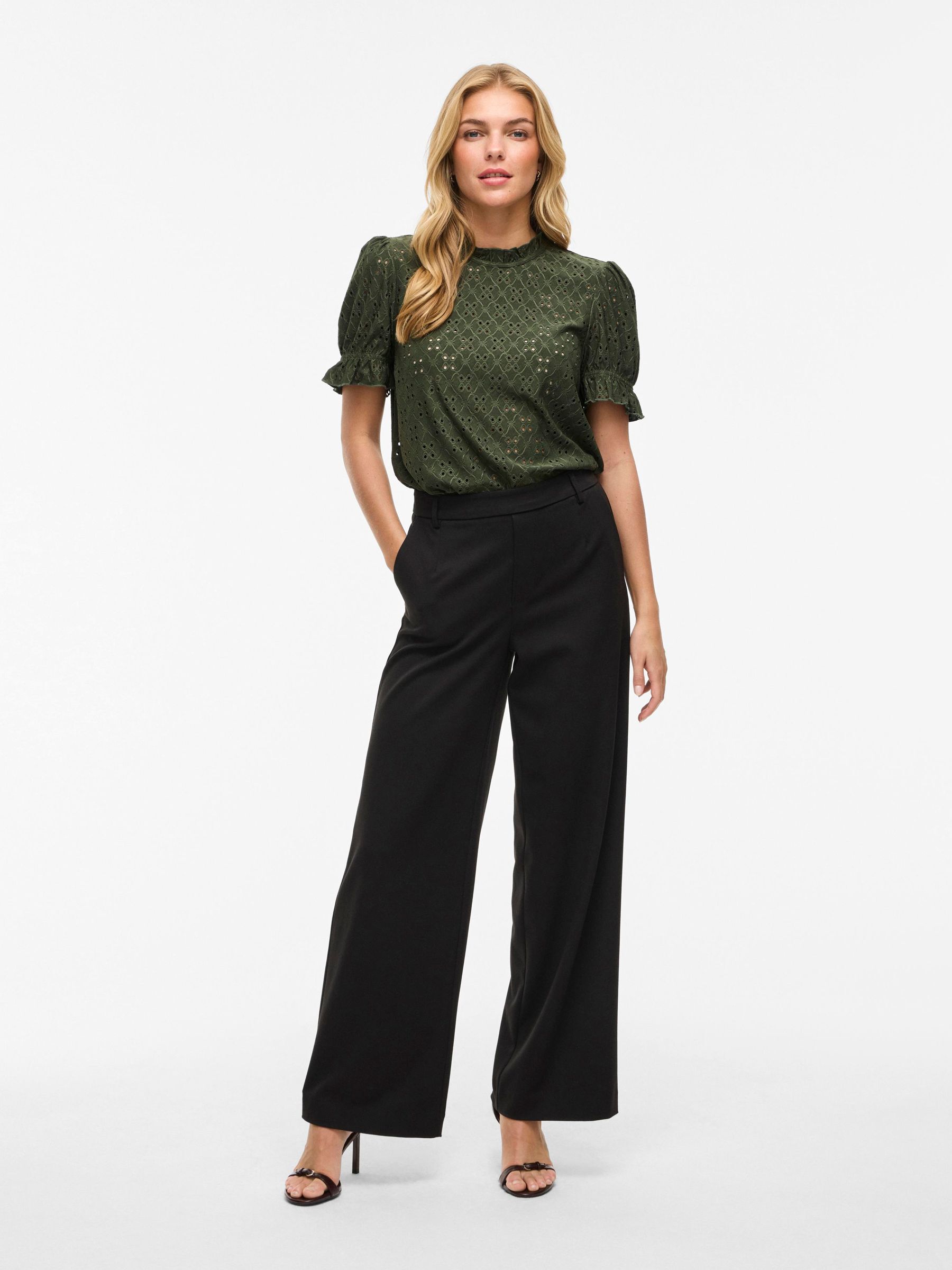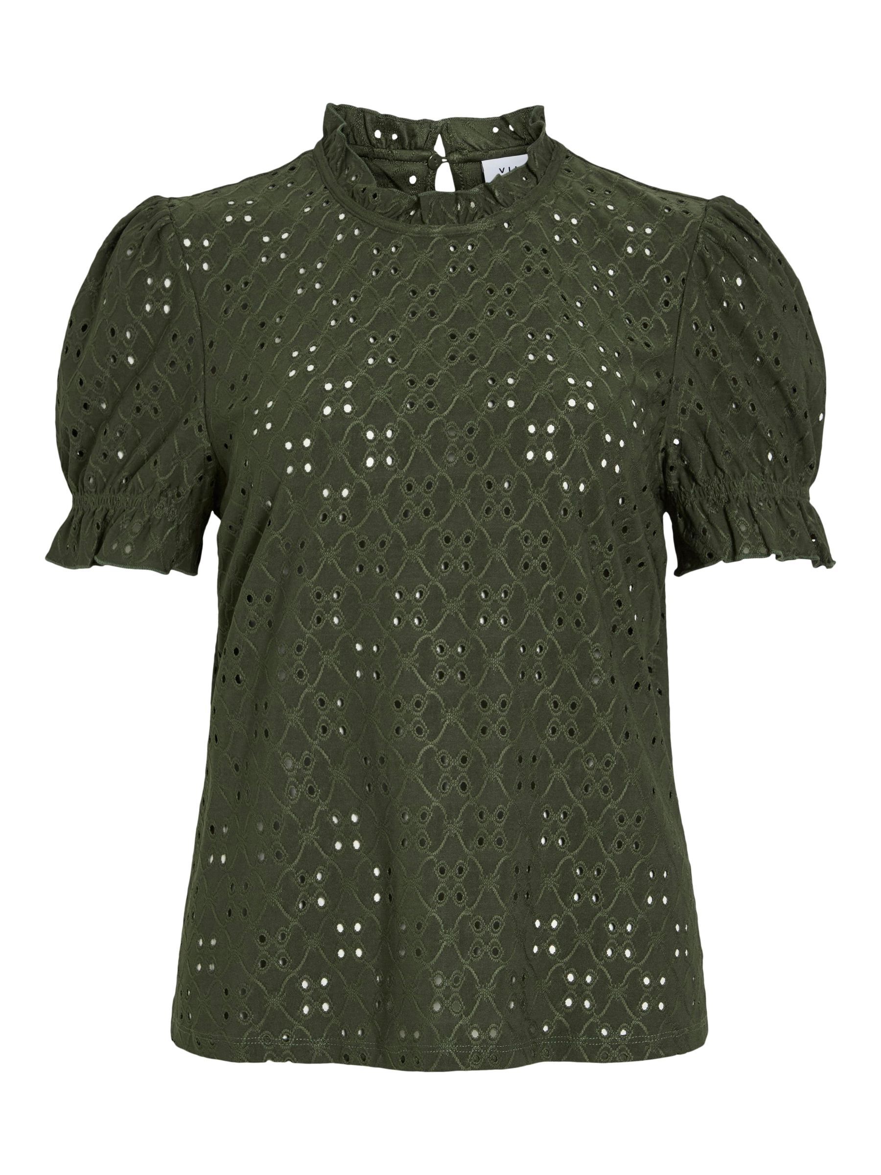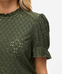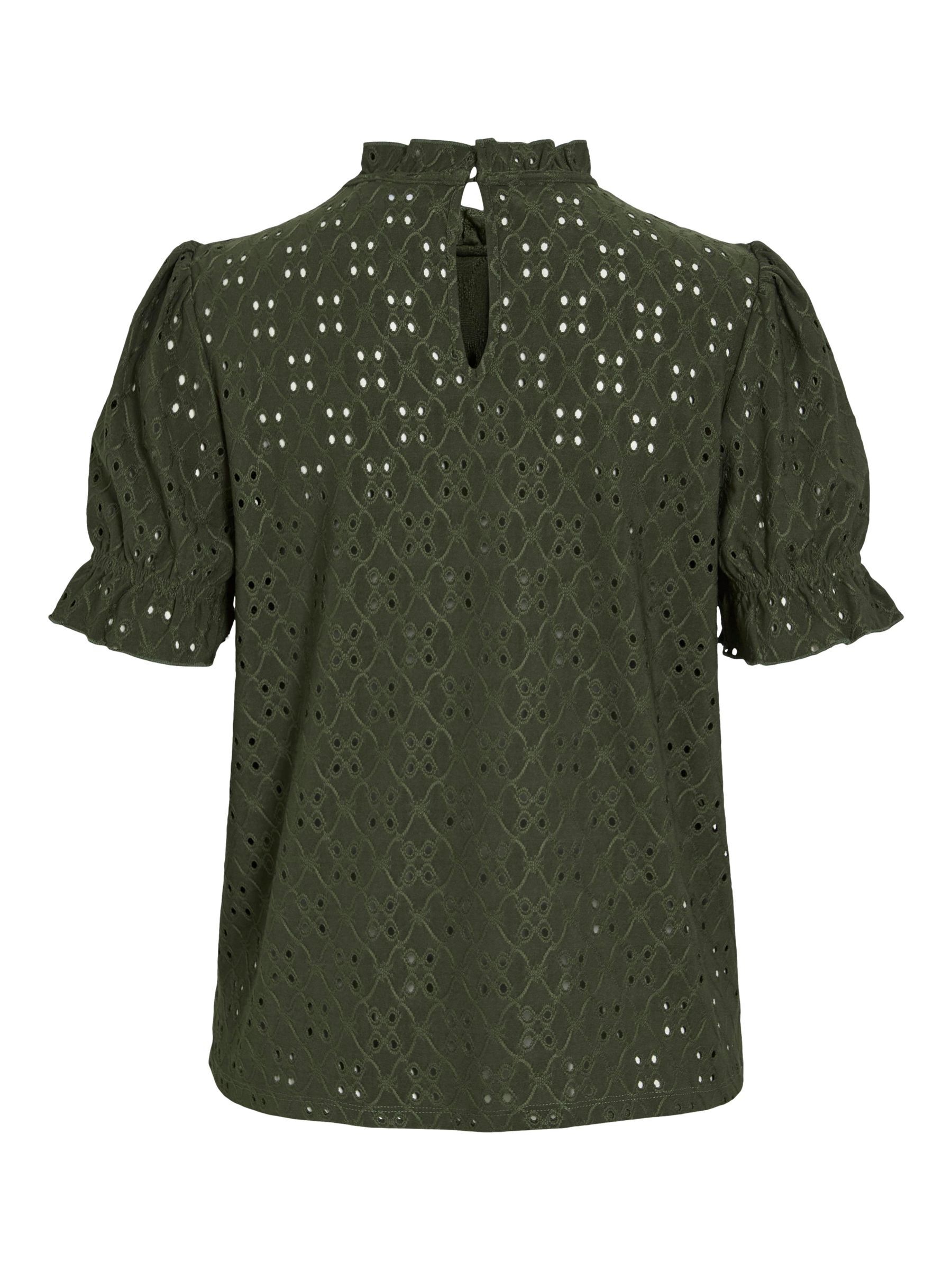 – Short-sleeved, detailed blouse- Ruffle neckline with keyhole closure at back- Embroidered and perforated design- Ruffle details at sleeves- Stretchy fabric- Length: 63 cm in size M- Sleeve length: 24 cm in size M- Our model is 178 cm tall and wears size M