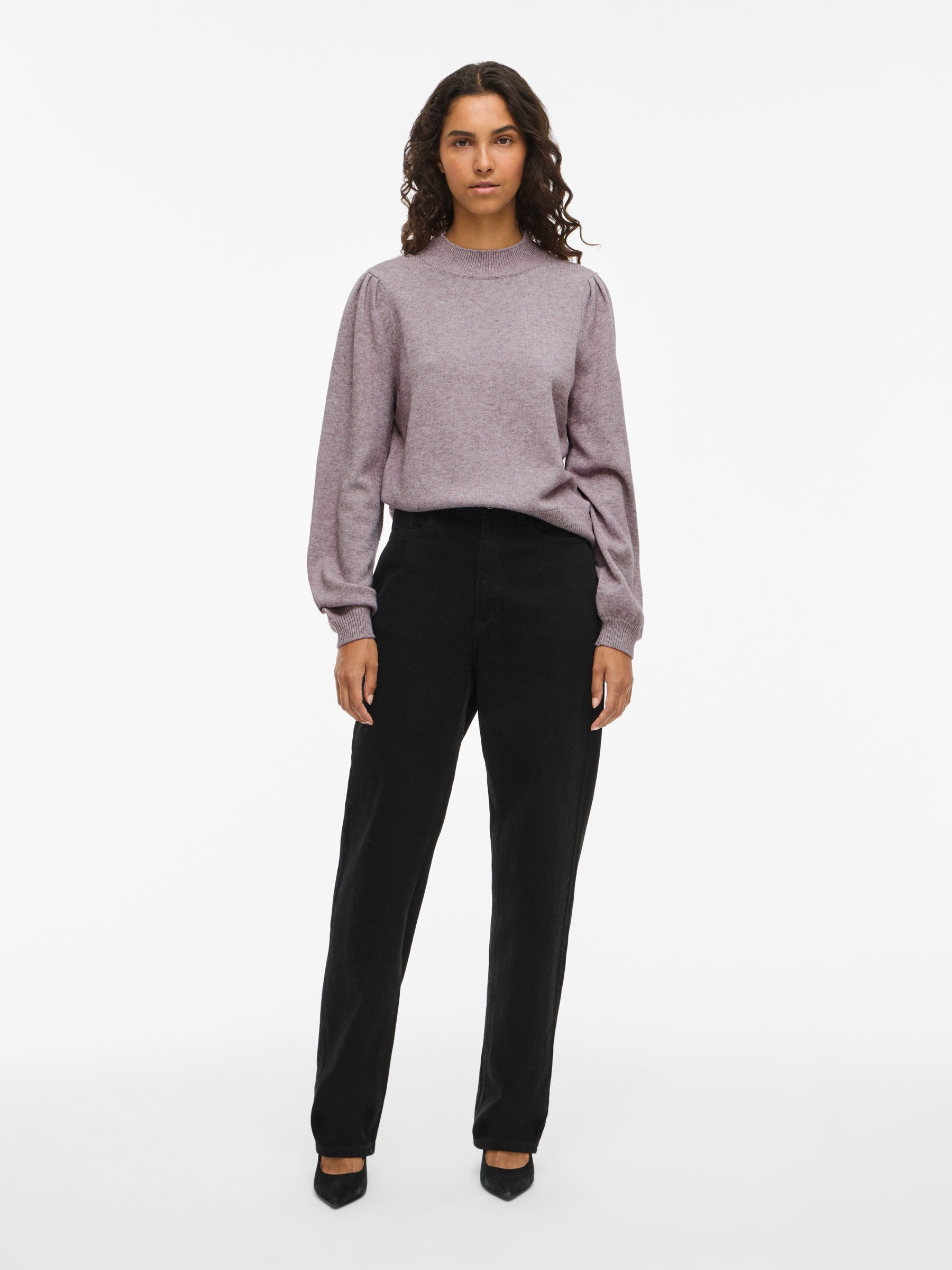– Knitted jumper- High rib neck- Puff shoulders- Rid edges- Soft, stretchy knit- Regular fit- Length: 56 cm in size M- Sleeve length: 65 cm in size M- Our model is 180 cm tall and wears size M