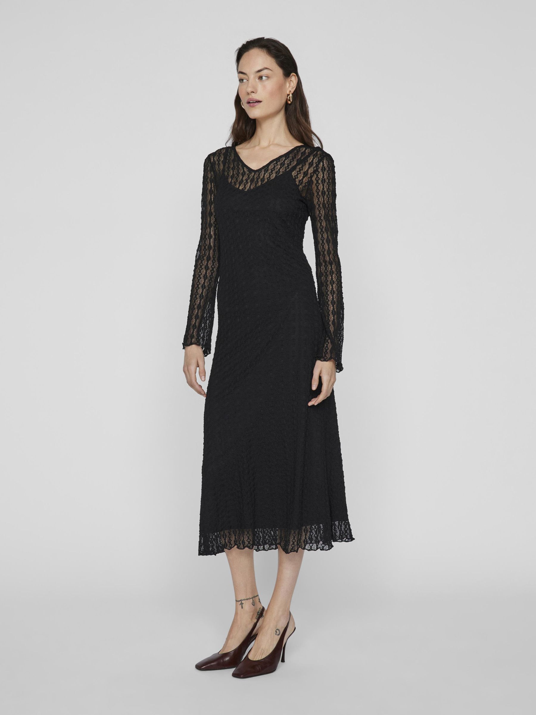 • Midi lace dress• Long sleeves• V-neck• Comes with inner strap dress• Regular fit• Length: 125 cm in size M• Sleeve length: 66 cm in size M