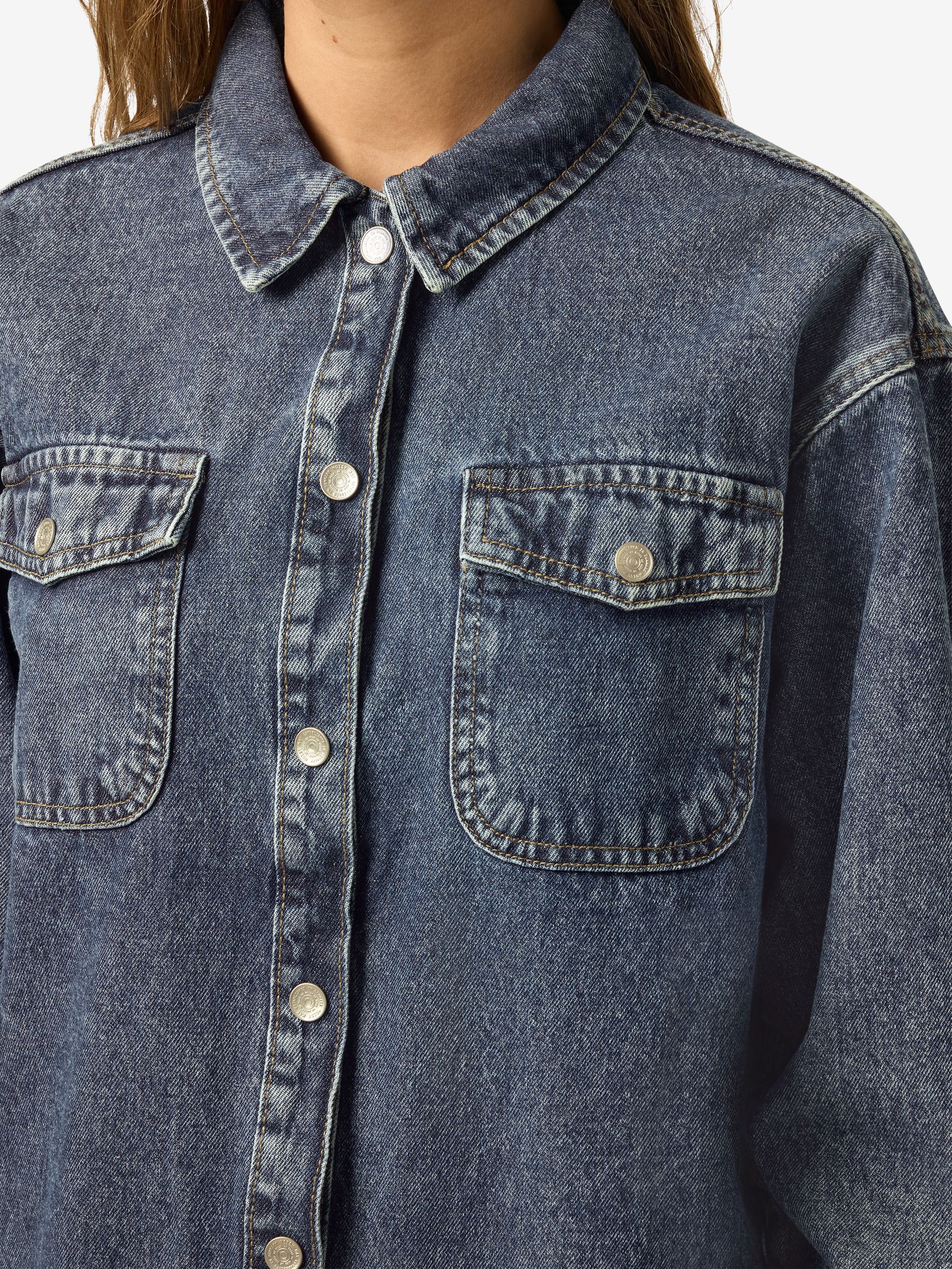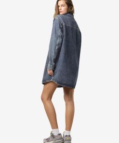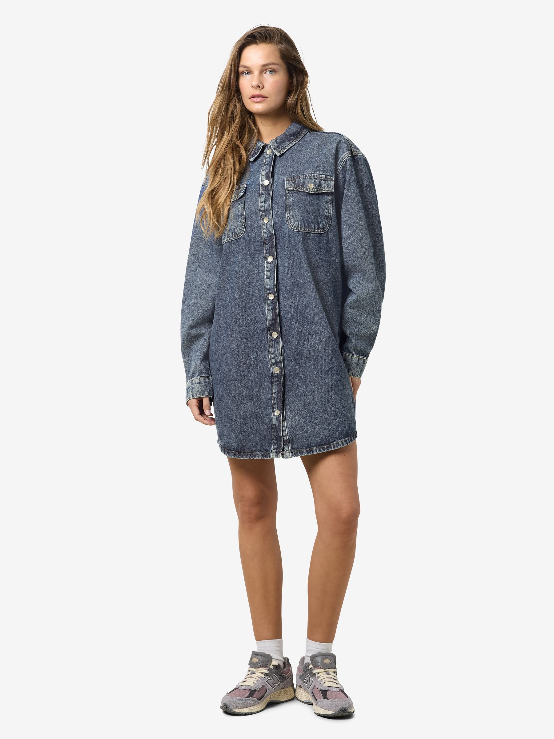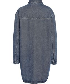 – Mini length denim dress- Spread collar- Dropped shoulders- Long sleeves with rivet button cuffs- Patch pockets at chest with rivet button fastening- Button-up front- Curved hem- Relaxed fit