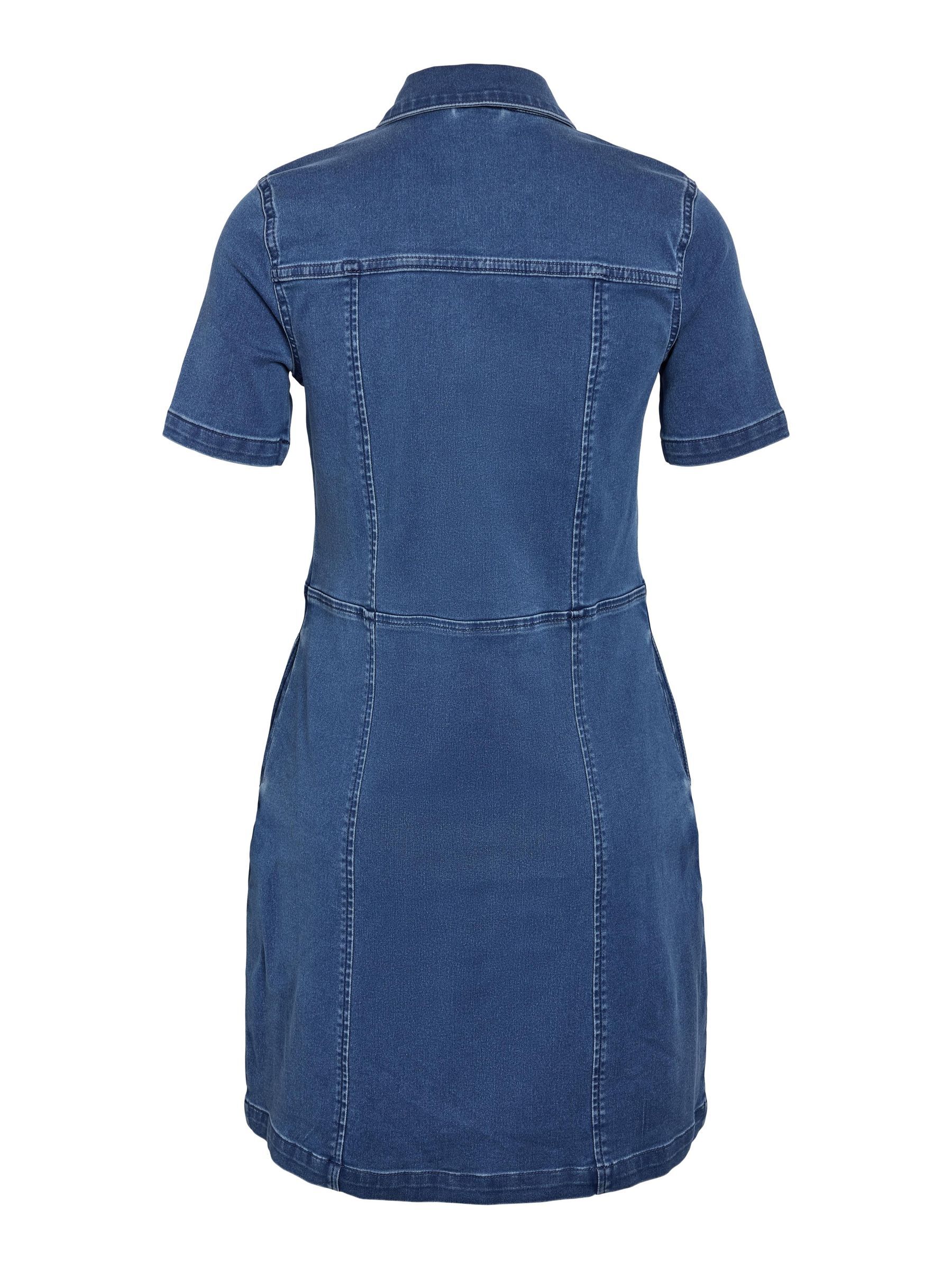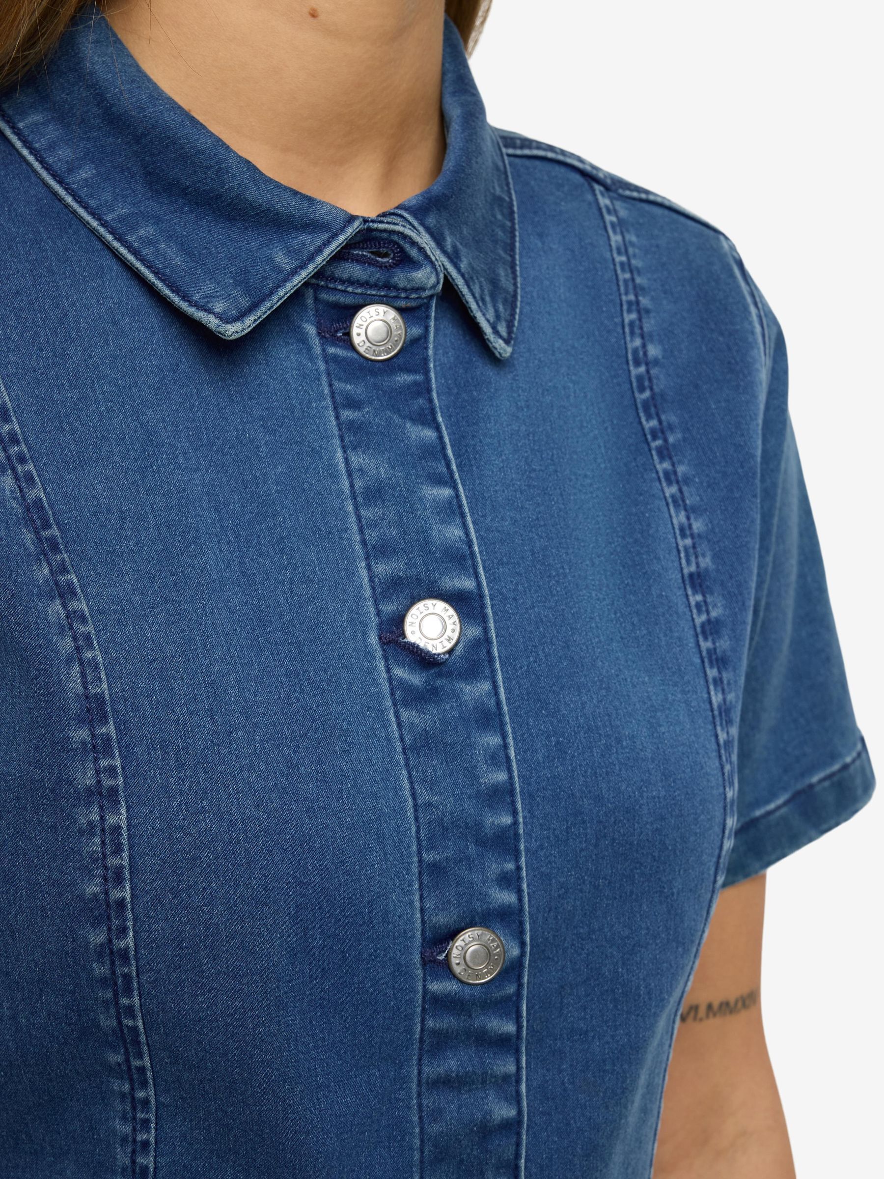 – Denim mini dress- Regular collar- Short sleeves- Button-up front- Regular fit