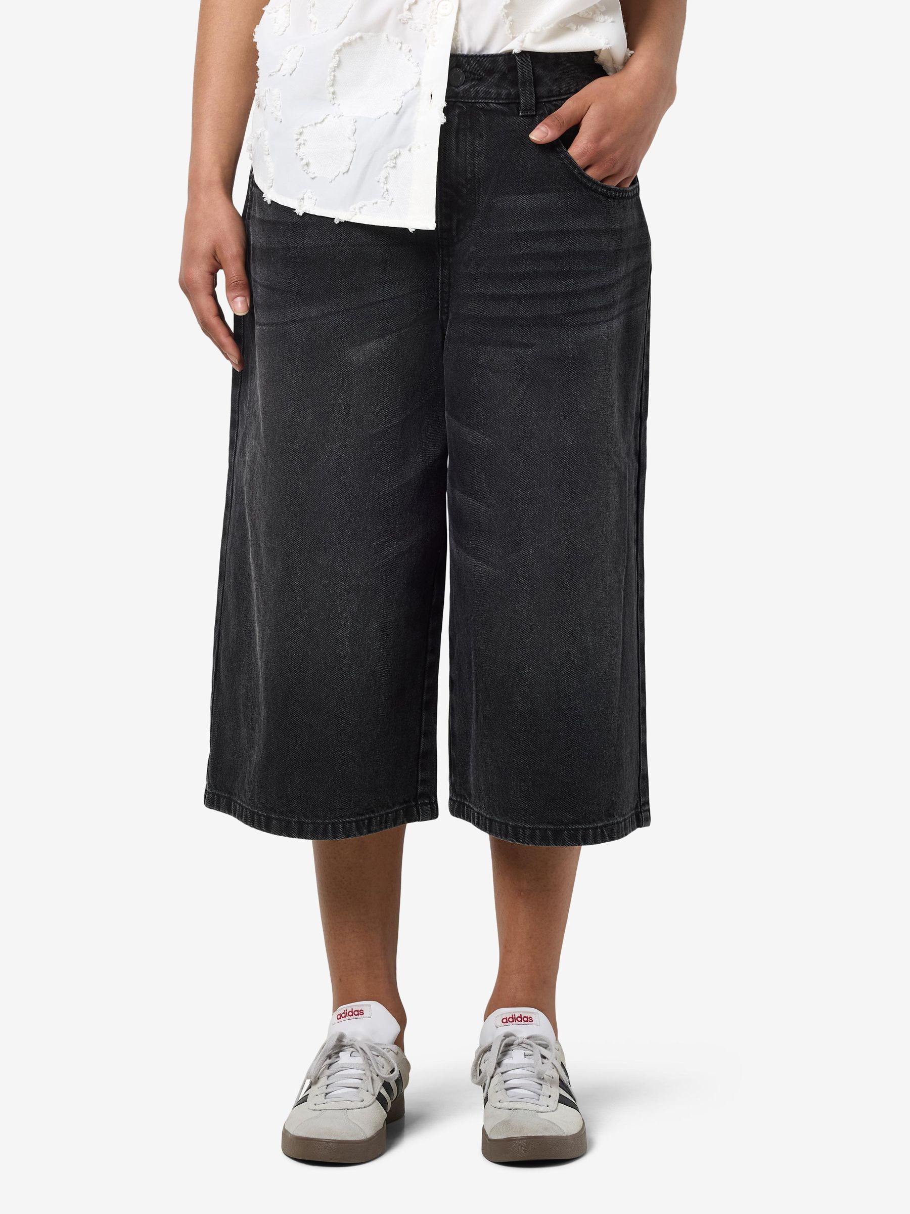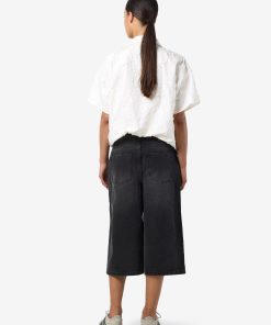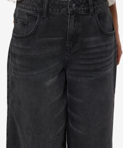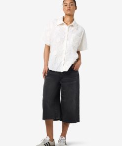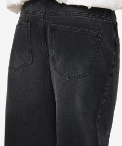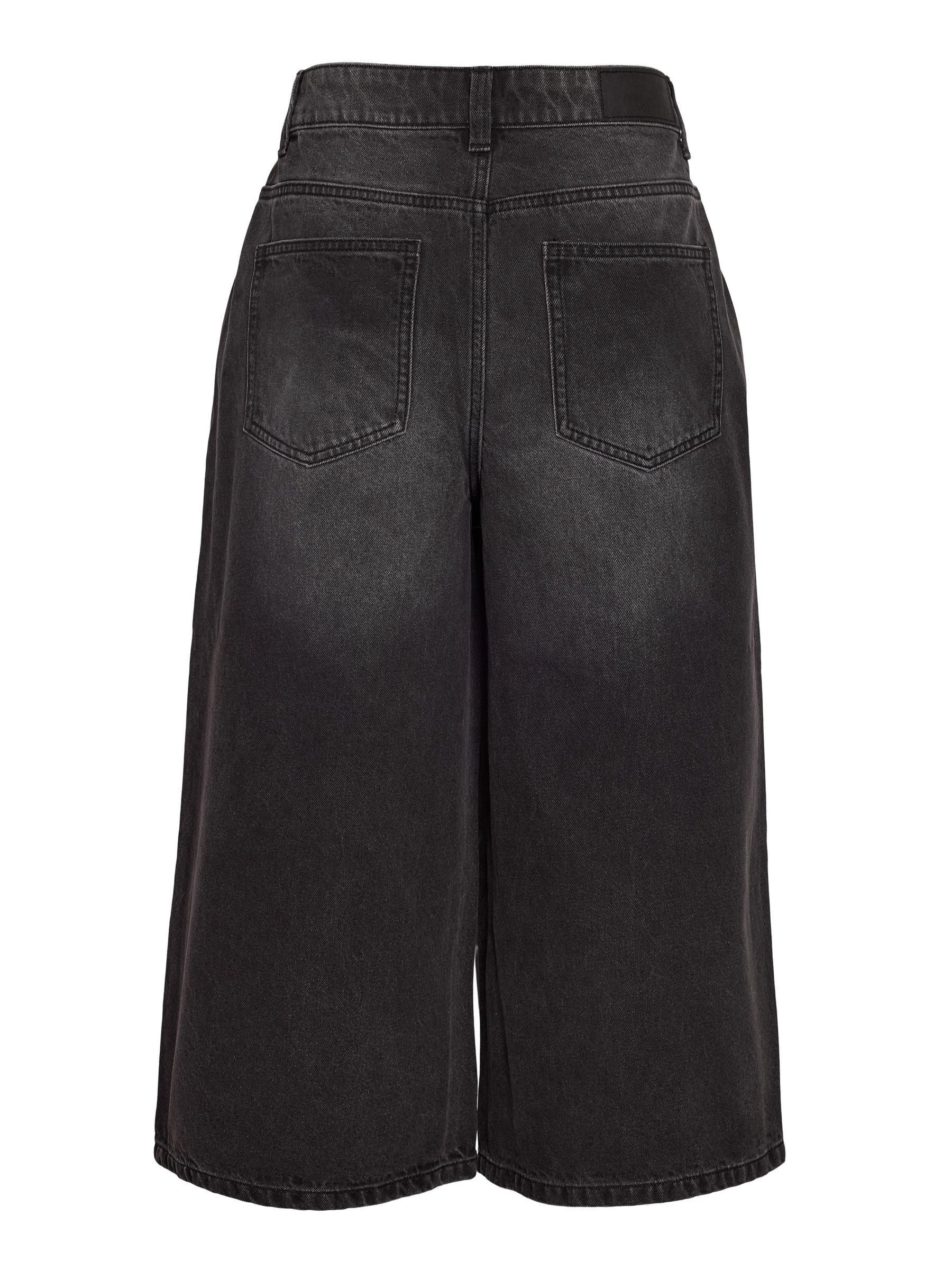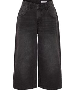 – Long denim shorts- Normal waist with belt loops- 5-pocket design- Jacron patch- Zip fly with rivet button fastening- Faded effect- Loose fit