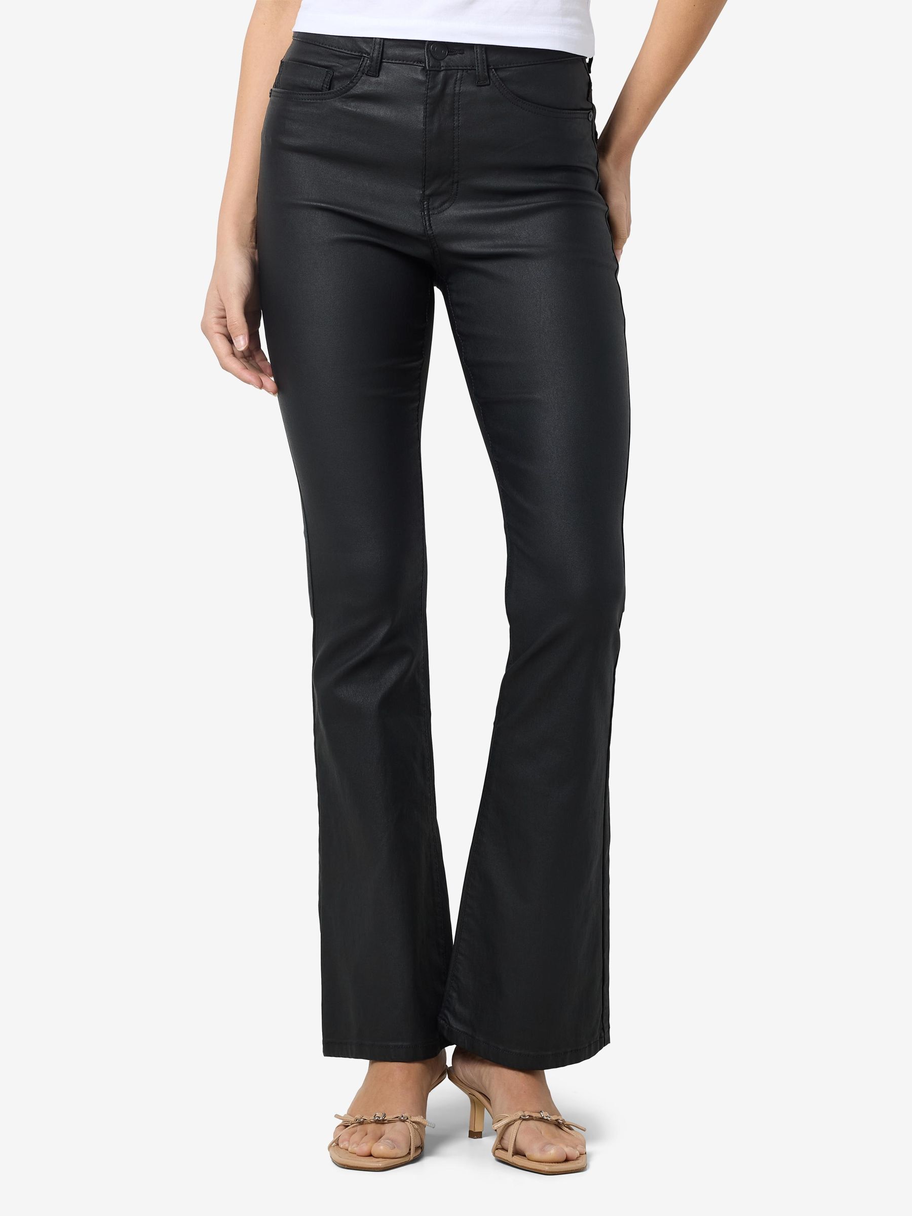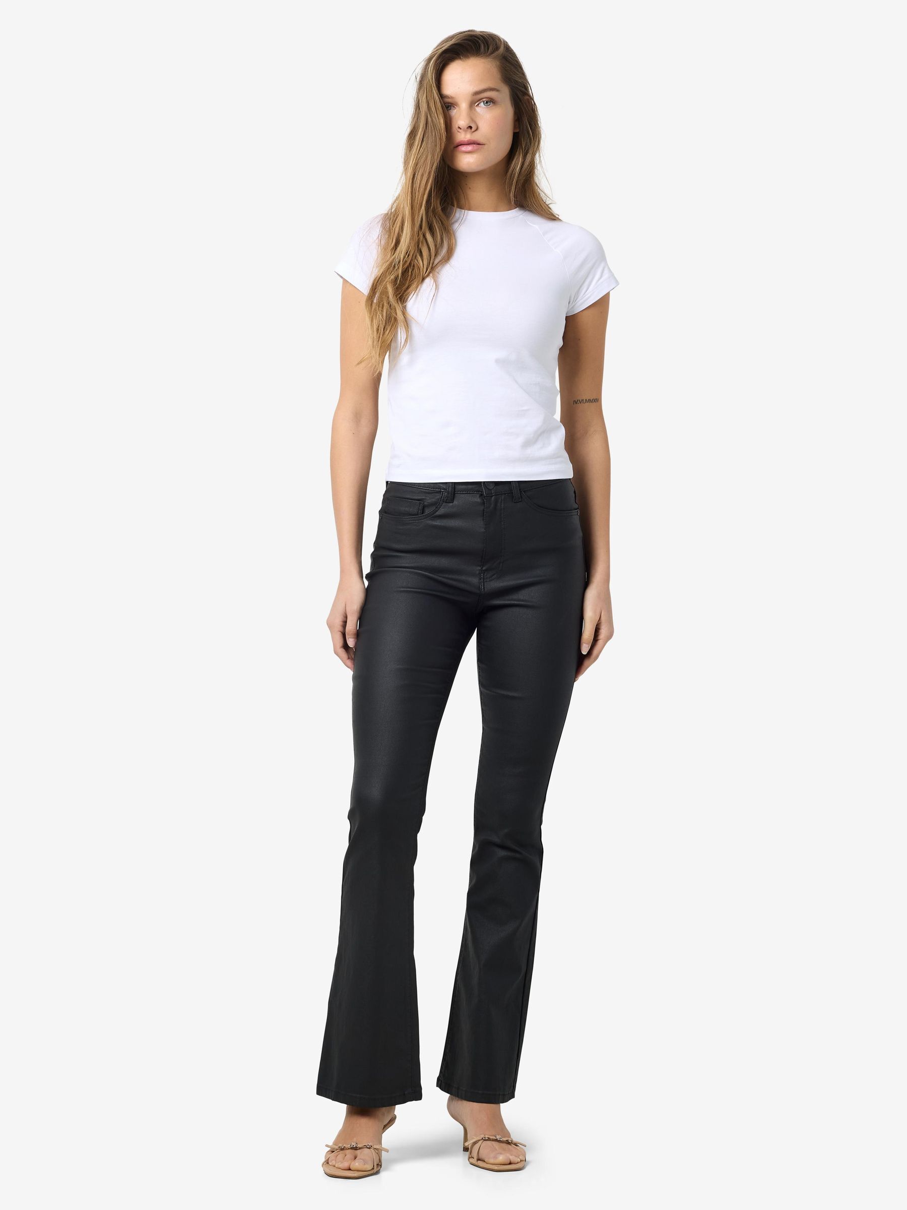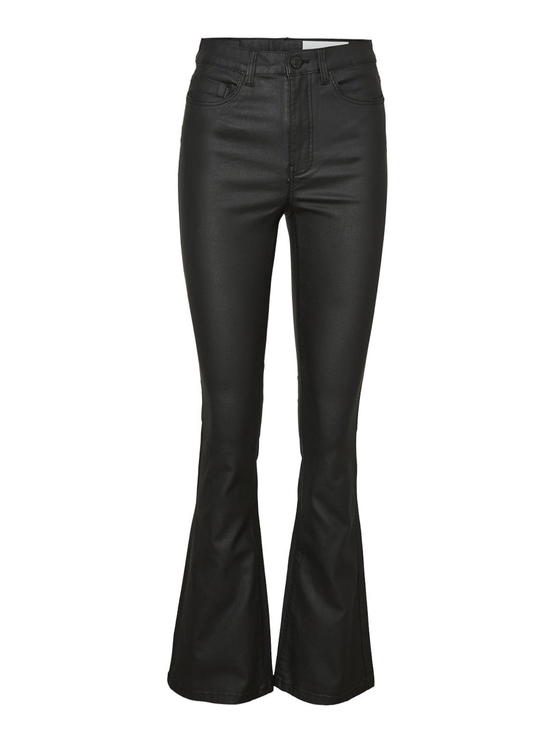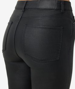 – Coated trousers – High waisted- Flared leg- Belt loops at waist – Zipper and single button fastening at front- Five pockets – Skinny fit