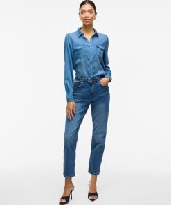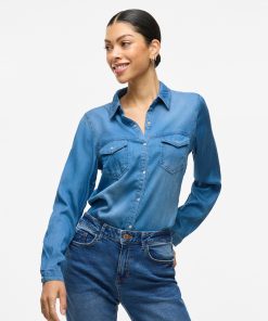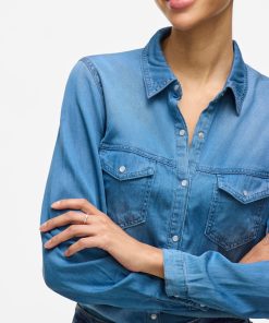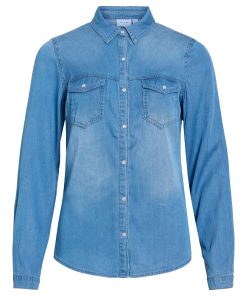 – Style name: VIBISTA- Denim shirt- Press buttons- Pockets at the chest- Long sleeves with button at the bottom- Length: 70 cm in size M- Sleeve length: 63 cm in size M- Our model is 179 cm tall and wears size M