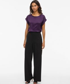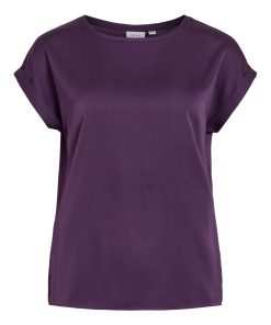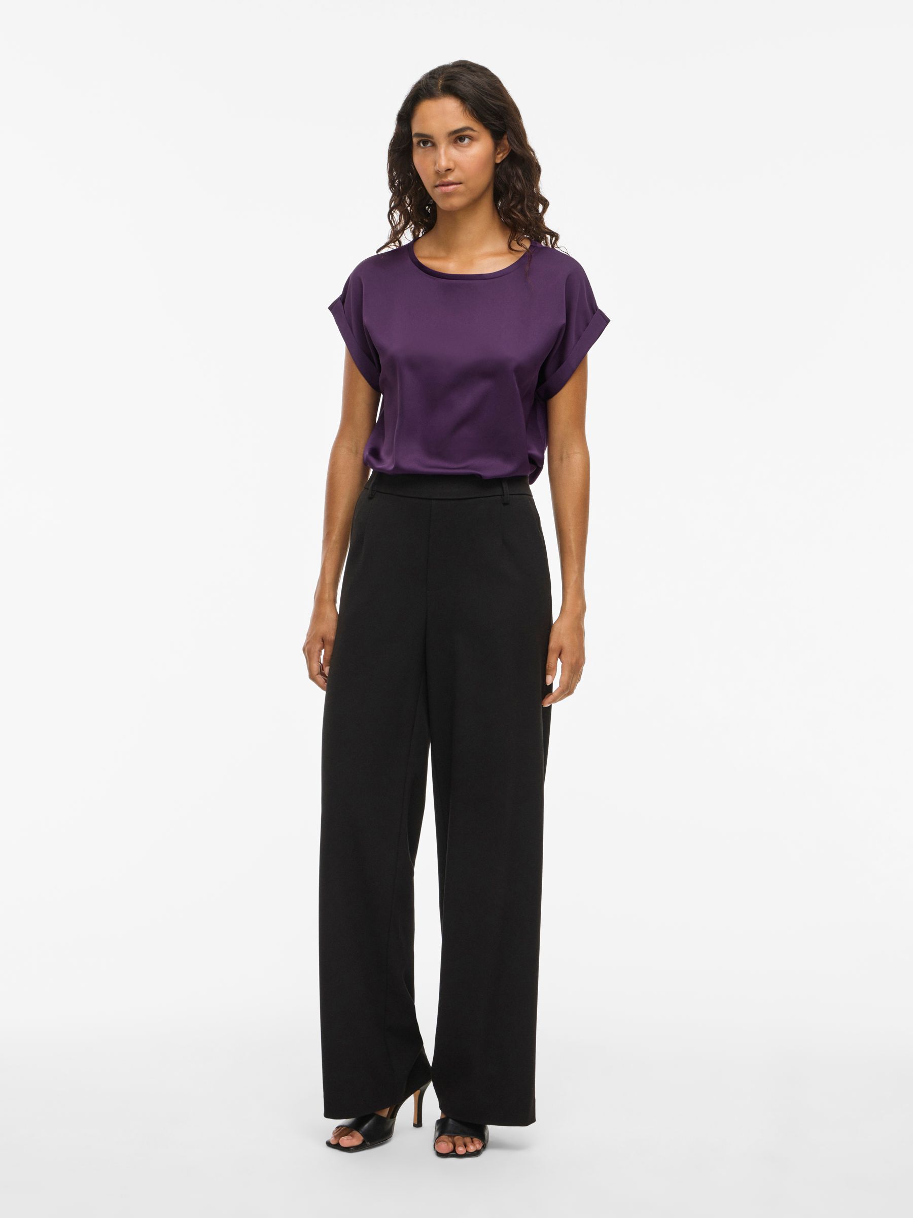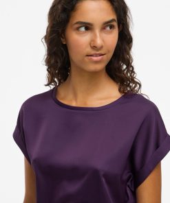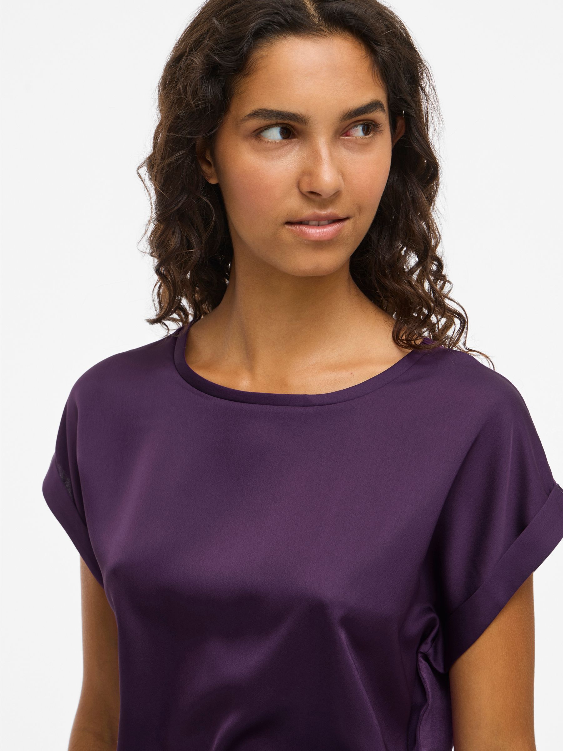 – Short sleeved, round neck top- Satin-look – Light material- Non-stretchable material- Length: 61 cm in size 38 – Sleeve length: 11 cm in size 38- Our model is 178 cm tall and wears size 38