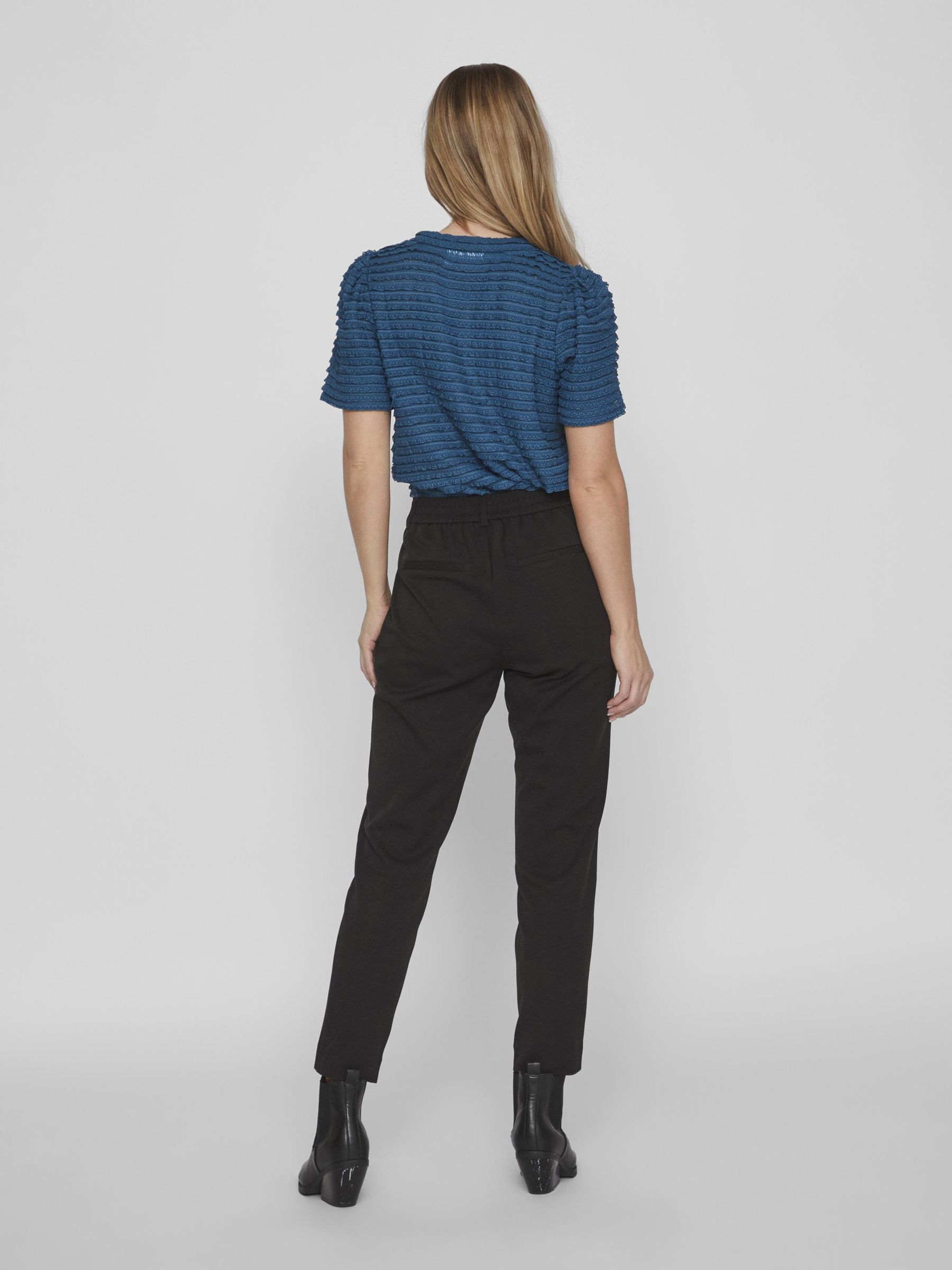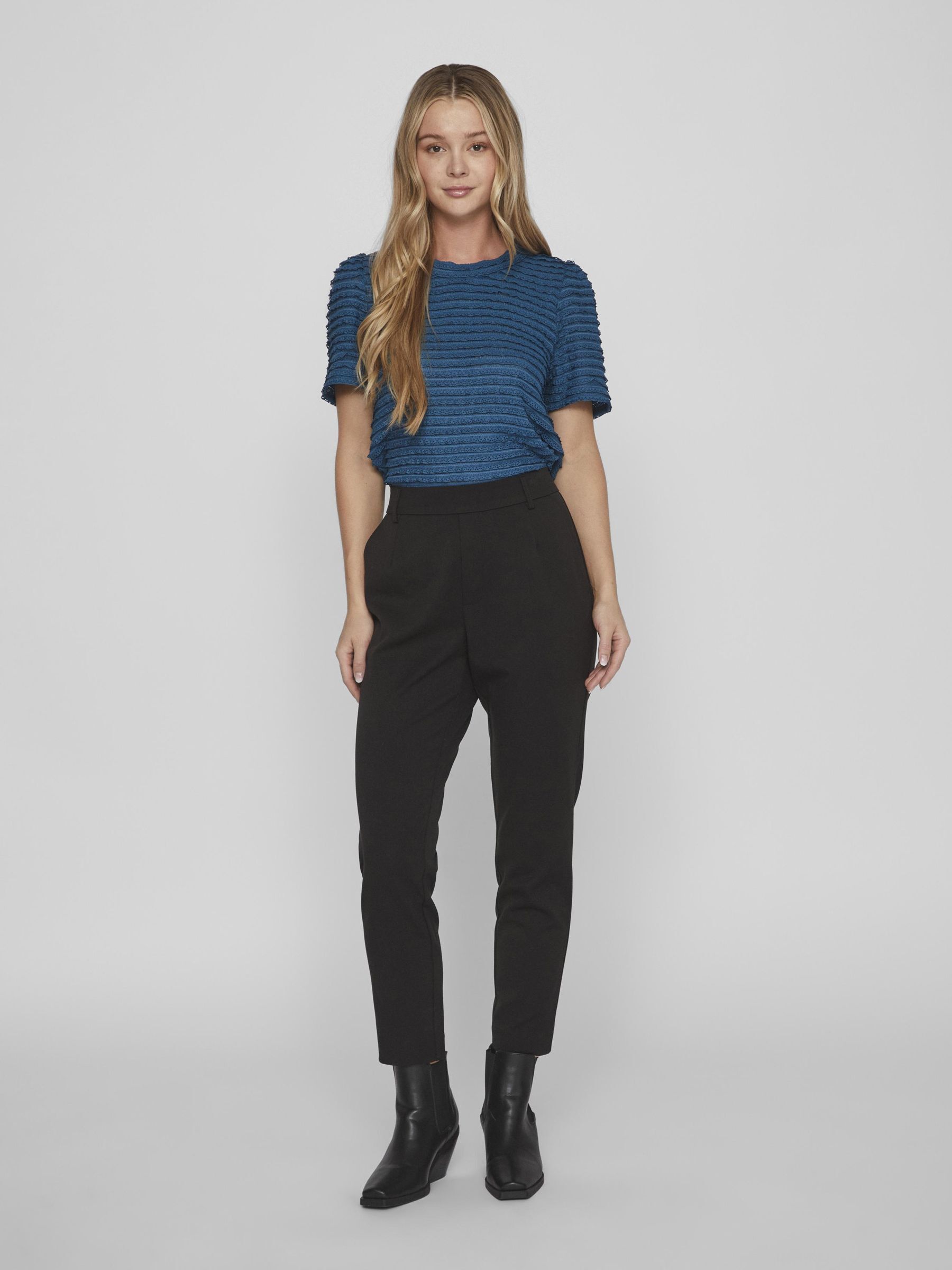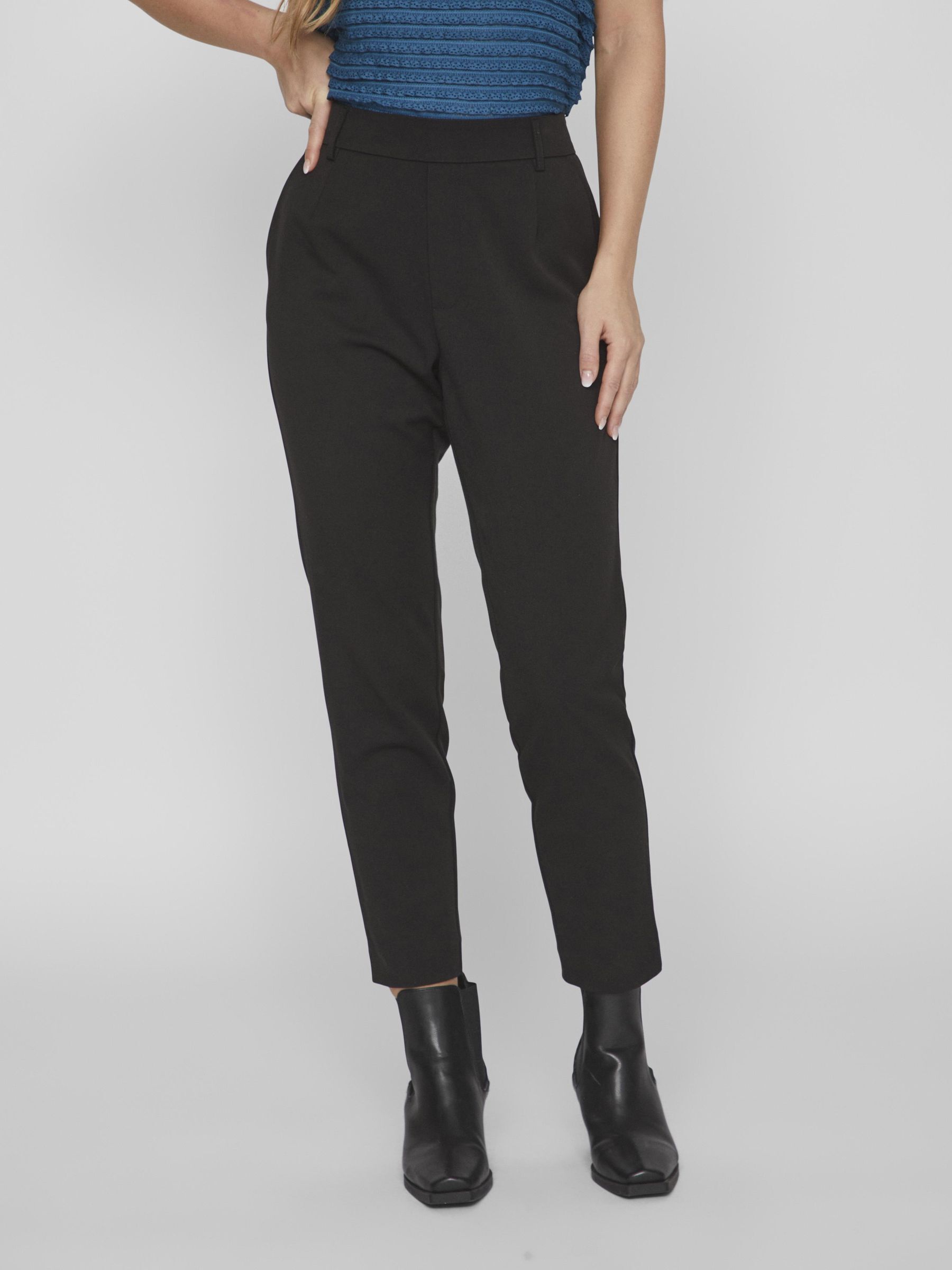 – High waist pants- Stretch-back waist- Faux zip fastening- Side pockets- Decorative back pockets- Belt loops – Straight, slim fit- Inseam: 69 cm in size 38- Frontrise: 28 cm in size 38