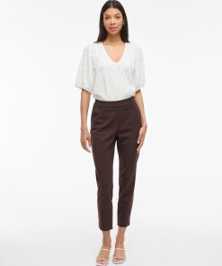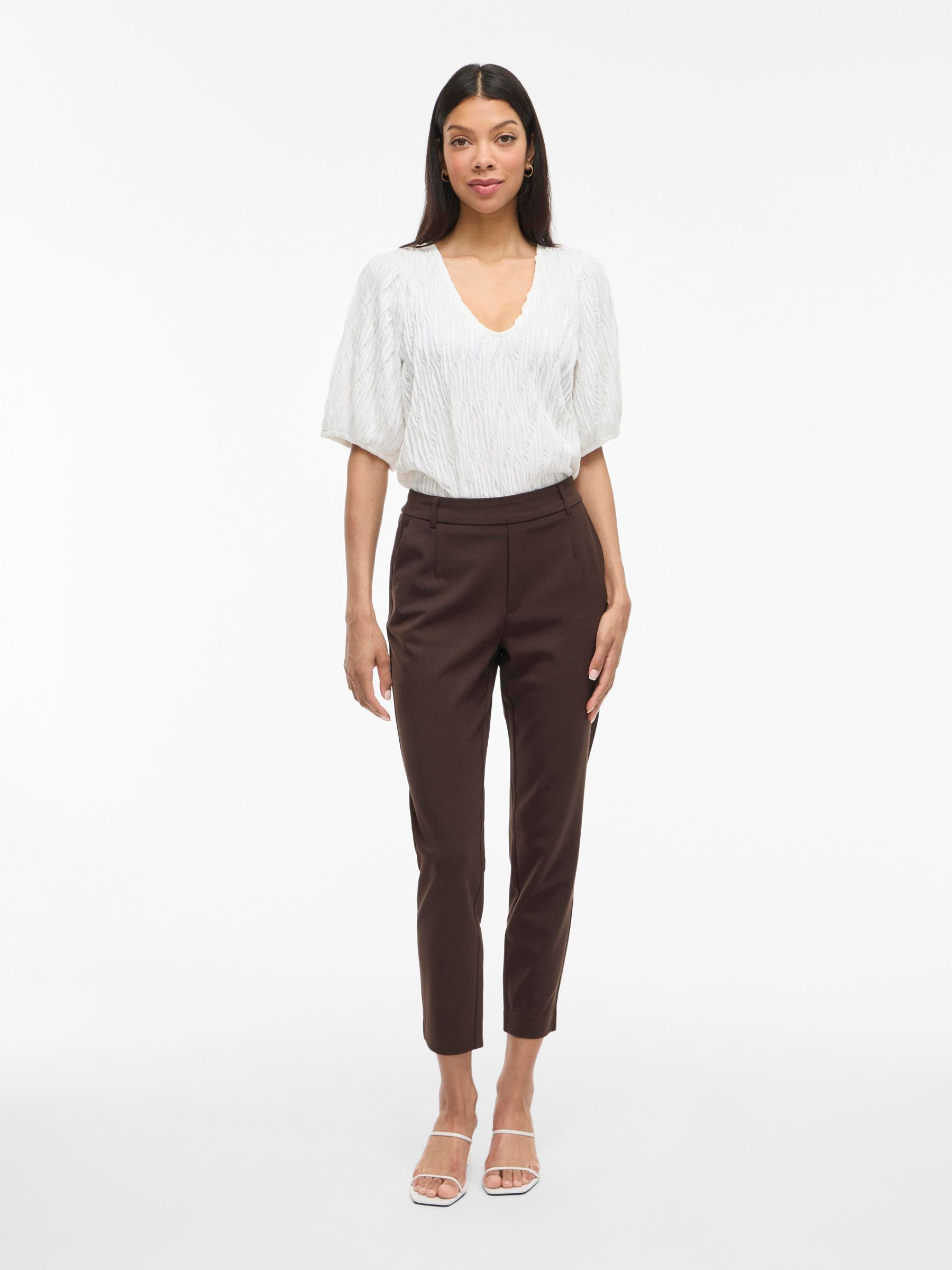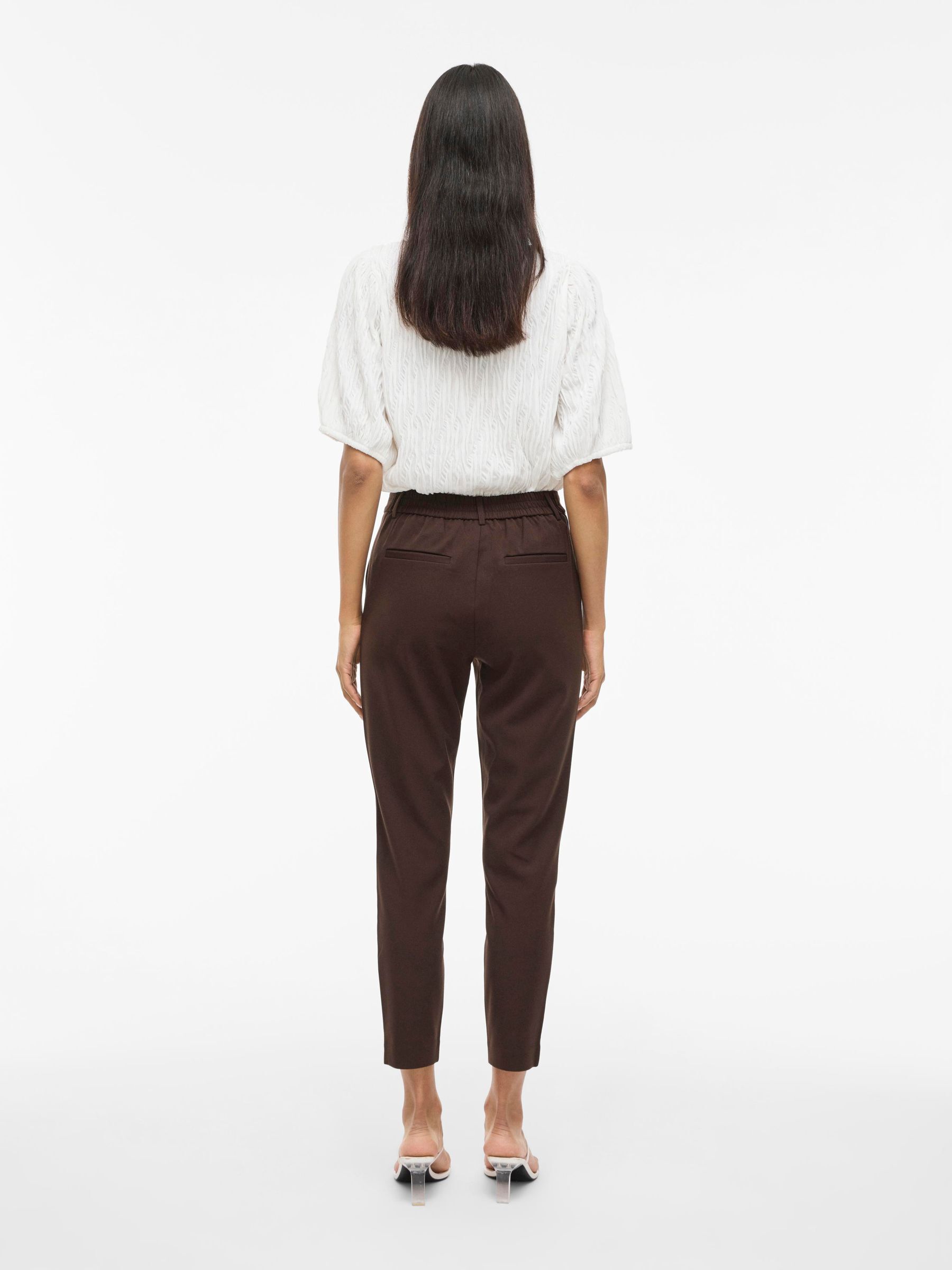 – High waist pants- Stretch-back waist- Faux zip fastening- Side pockets- Decorative back pockets- Belt loops – Straight, slim fit- Inseam: 69 cm in size 38- Frontrise: 28 cm in size 38