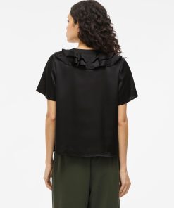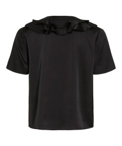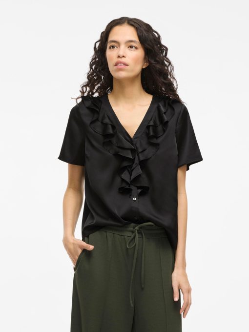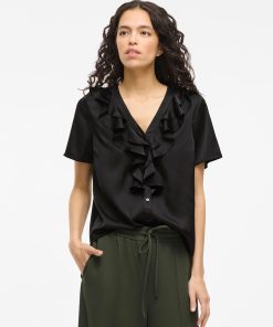 • Short-sleeved shirt with frill details• V-neck• Front button fastening• Satin-look• Regular fit• Length: 60 cm in size 38• Sleeve length: 23 cm in size 38